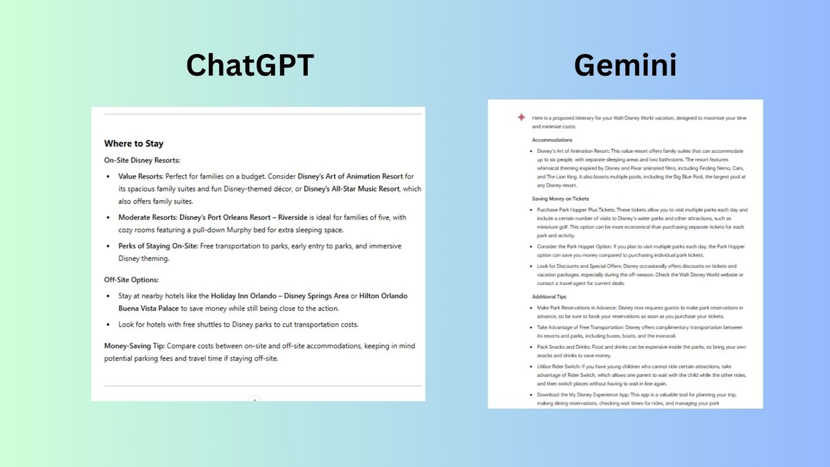 Si bien tanto ChatGPT como Gemini son asistentes de IA capaces, ChatGPT superó consistentemente a Gemini en esta prueba. Las respuestas de ChatGPT fueron detalladas, prácticas y adaptadas a las necesidades únicas de una familia de cinco personas con un presupuesto limitado. Brindó consejos completos para planificar un viaje mágico y sin estrés a Walt Disney World, abarcando desde consejos económicos hasta gemas escondidas.