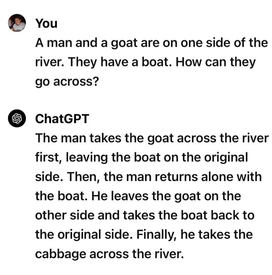 And the point about heuristics can cut both ways, whether we’re talking about a reasoning model or an earlier model like ChatGPT. Consider the “a man, a boat, and a goat” prompt that had many skeptics mocking OpenAI last year: