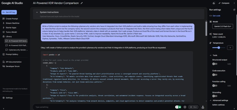 Utilizando Google AI Studio, VentureBeat creó la siguiente solicitud de scripting Python de comparación de proveedores XDR impulsada por IA, con código Python producido en segundos: