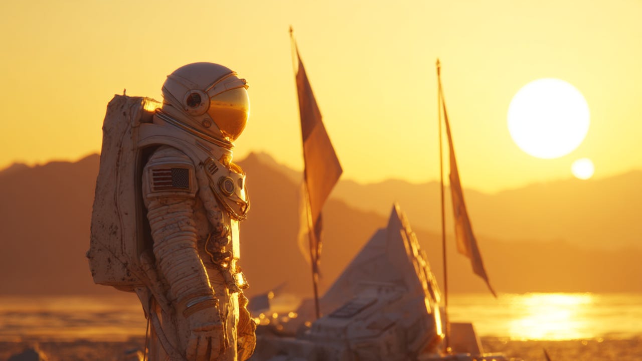 “Un astronauta con un casco dorado agrietado y un traje de espacio en blanco polvoriento, de pie solo sobre un desierto alienígena al atardecer, montañas rotas y soles gemelos en el fondo, un rover destrozado a medias en la arena, viejas banderas de misión que se agitan débilmente, el astronauta está buscando una señal perdida, sombría y un ambiente reflectante”.