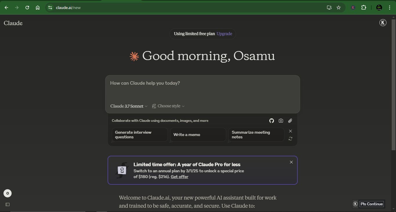 Onboarding with Claude was quick and straightforward. You’re welcomed with a clean, minimalist interface. There’s no clutter, which I appreciated.
